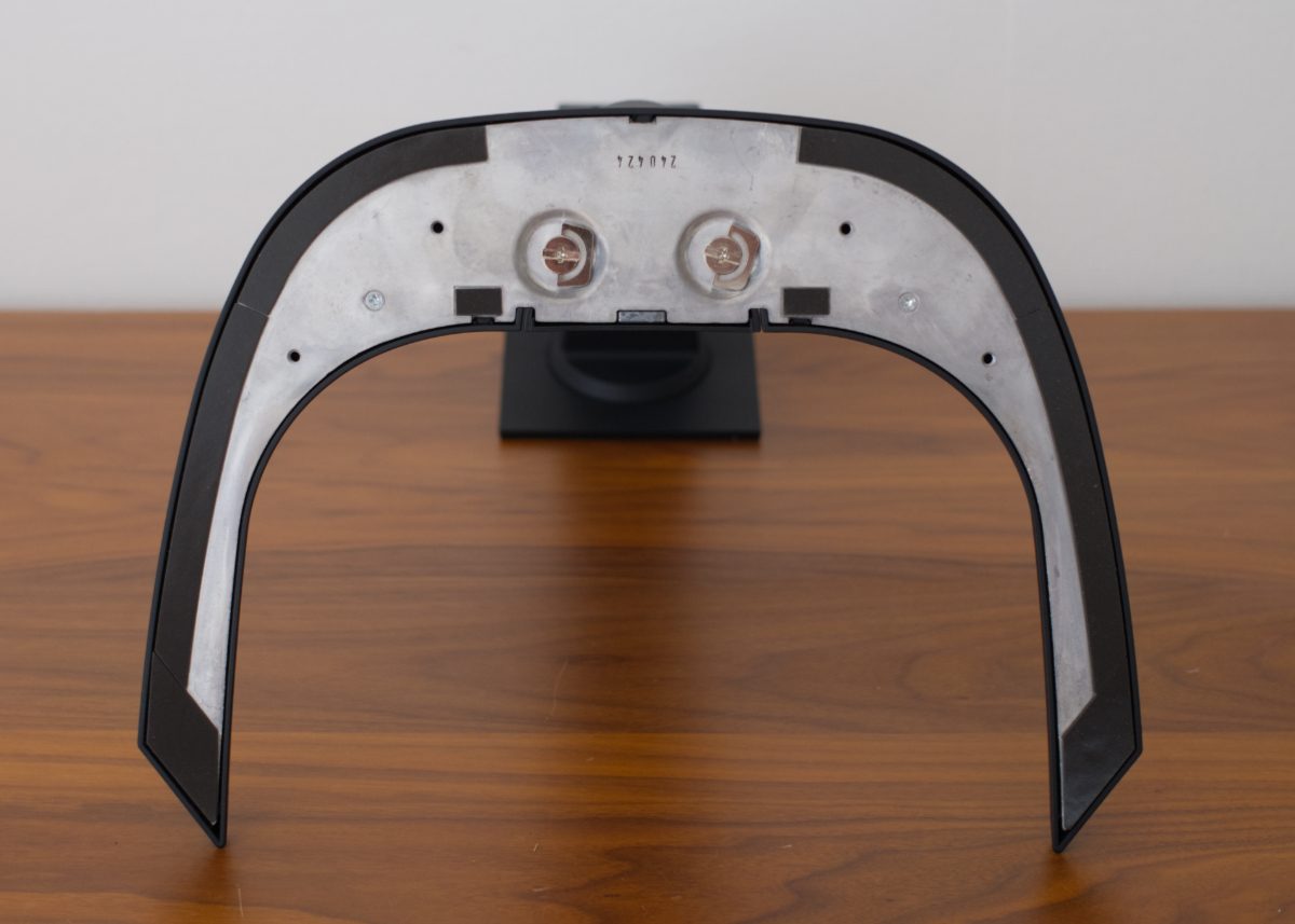 Der Rahmen des Displays misst seitlich 2 mm, oben 16 mm und unten 25 mm. Im oberen Rahmen sind die Webcam mit Mikrofonen und der Infrarotsensor integriert, im unteren die Lautsprecher, die Sensortasten, die Status-LED und der Lichtsensor. Im Betrieb ist bis zur eigentlichen Bilddarstellung ein zusätzlicher Panel-Rahmen vorhanden. Dieser beträgt seitlich und oben 7 mm, unten 3 mm und entsteht durch die ungenutzte Display-Fläche.