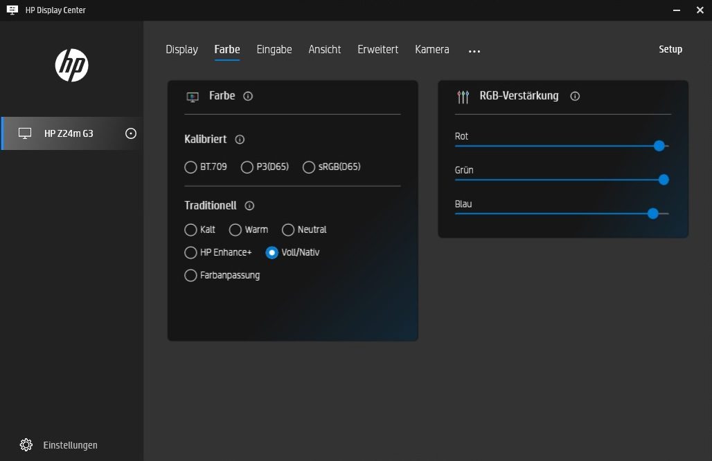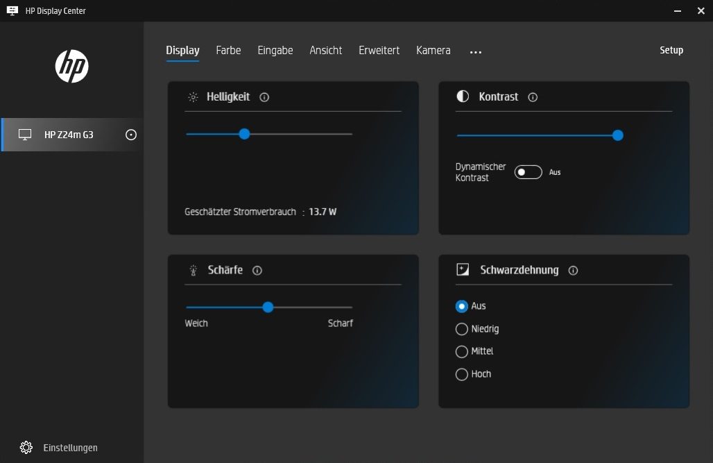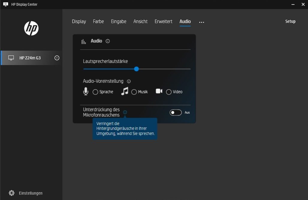 Im OSD des HP Z24m G3 sind weder Einstellungen für die Kamera noch für das Mikrofon möglich. Über die Software „HP Display Center“ werden dagegen verschiedene Einstelloptionen angeboten. Diese sind zwar nützlich und bieten auch einen Mehrwert an, dürften von vielen Anwendern aber nicht genutzt werden können, da Arbeitgeber häufig verbieten, diese Zusatzprogramme zu installieren. Wir hätten uns daher einige Grundfunktionen auch direkt im OSD des Geräts gewünscht.
