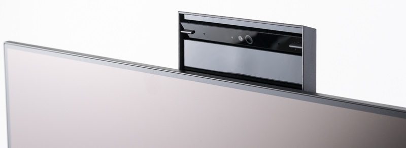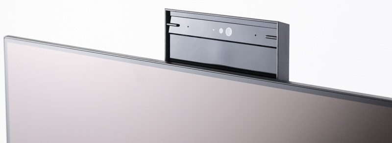 Das Modul für Kamera und Mikrofon befindet sich versteckt im oberen Monitorrahmen. Mit einem Druck auf diesen Bereich wird es nach oben herausgefahren, und nach der Benutzung kann es dort wieder hereingeschoben werden.