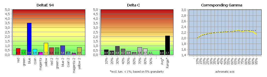 Bei den Buntfarben sind die Abweichungen im Durchschnitt gut, und auch die Maximalabweichung bei Blau bleibt im Rahmen (Delta-E94-Average: 0,82, Delta-E94-Maximum: 3,50).