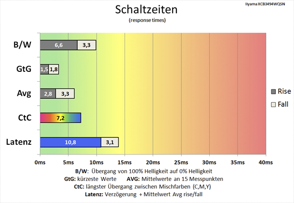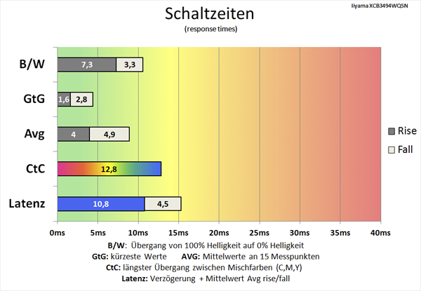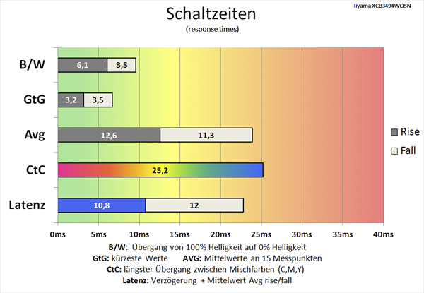 Das Schaltzeiten-Diagramm zeigt unter anderem, wie sich verschiedene Helligkeitssprünge addieren, wie schnell der Monitor in der Werkseinstellung im besten Fall reagiert und von welcher mittleren Reaktionszeit ausgegangen werden kann.