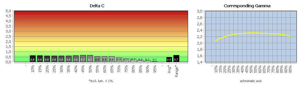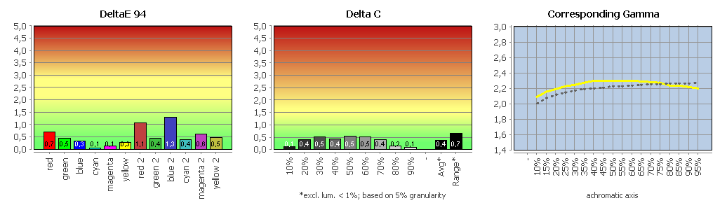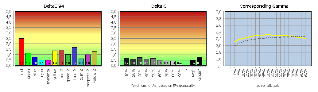 Das Ergebnis nach der Kalibrierung kann nur als ausgezeichnet bezeichnet werden, auch wenn der durchschnittliche Delta-E94-Wert von 0,76 nur ganz knapp ein sehr gutes Ergebnis darstellt. Wie schon bei allen anderen Messungen sind die Grauwerte wieder über jeden Zweifel erhaben.