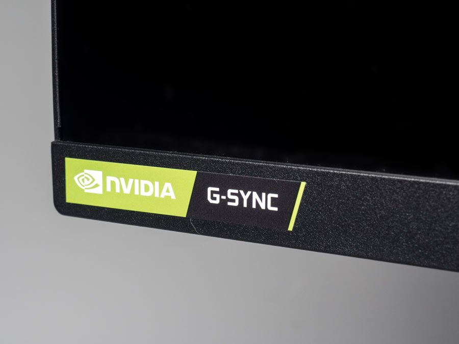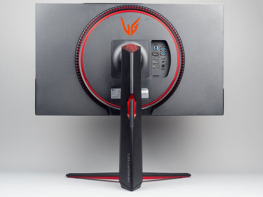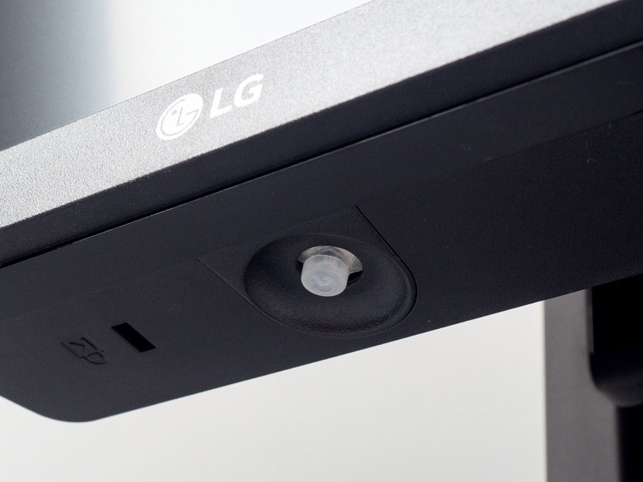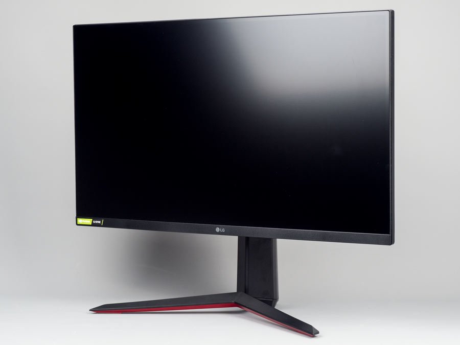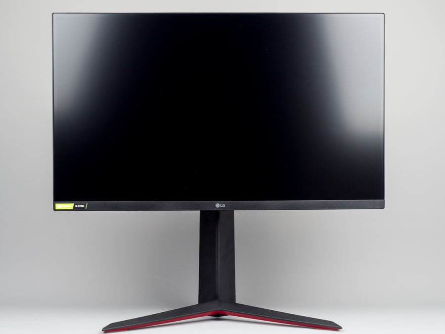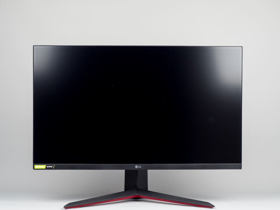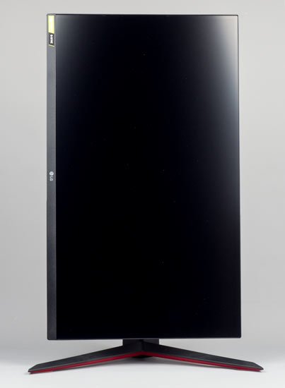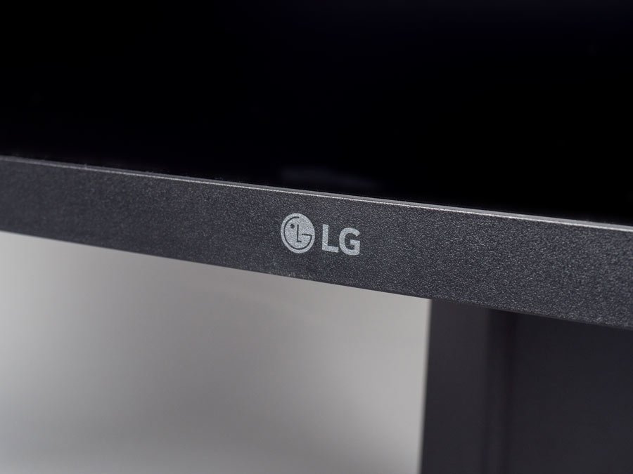 Das Display verfügt an drei Seiten über ein Frameless-Design, sodass das Panel oben und an den Seiten von einem schmalen Band eingefasst ist. Der untere Rahmen ist rund 18 mm dick. Mittig ist das LG-Logo in lichtem Grau aufgedruckt, während auf der rechten Seite der leuchtend grüne G-Sync-Badge aufgebracht ist, der sich aber problemlos entfernen lässt.