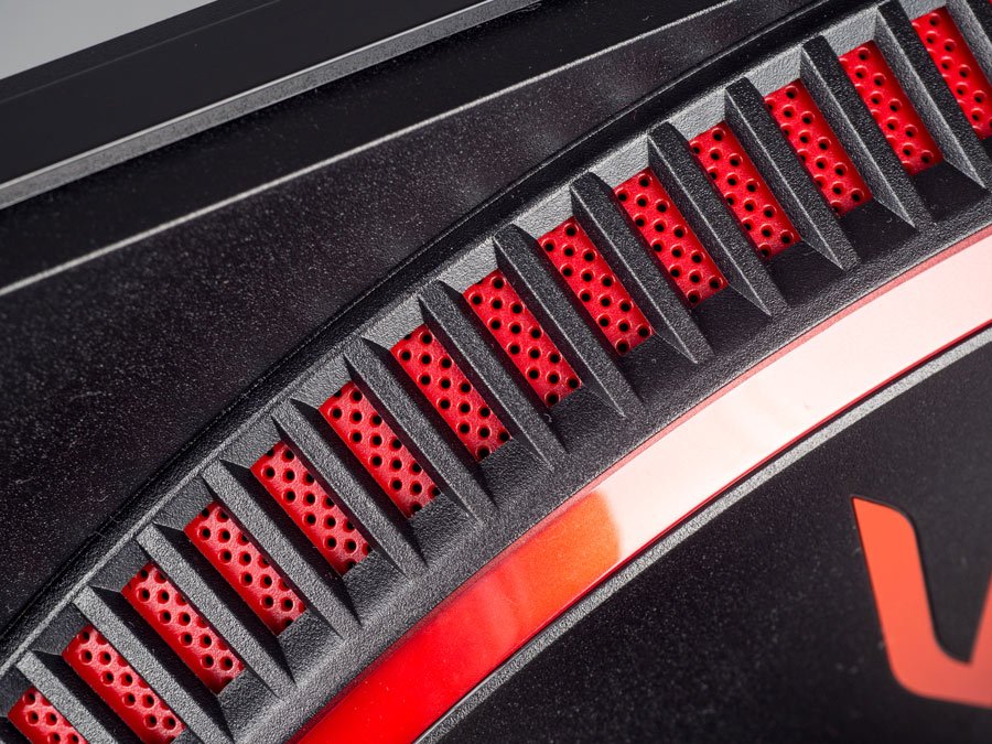 Auf der rechten Seite kann unterhalb des Monitors eine kleine Klemme angebracht werden, die als Haltevorrichtung für das Mauskabel dient. Die Tiefe des Displays beträgt rund 20 mm. Durch ein rundes Gehäuse, das etwas nach innen versetzt ist, gewinnt die Rückwand um weitere 30 mm an Tiefe und beherbergt die Elektronik des LG 27GP850. Die vielen kleinen Löcher an der Außenseite des Gehäuses dienen der Belüftung.