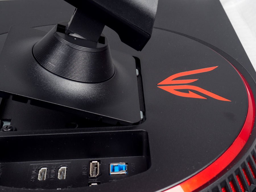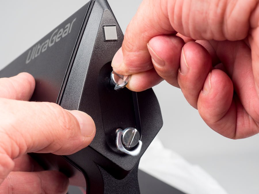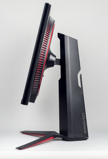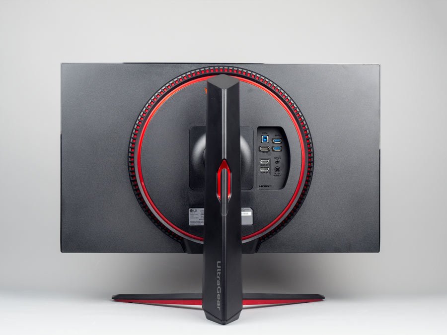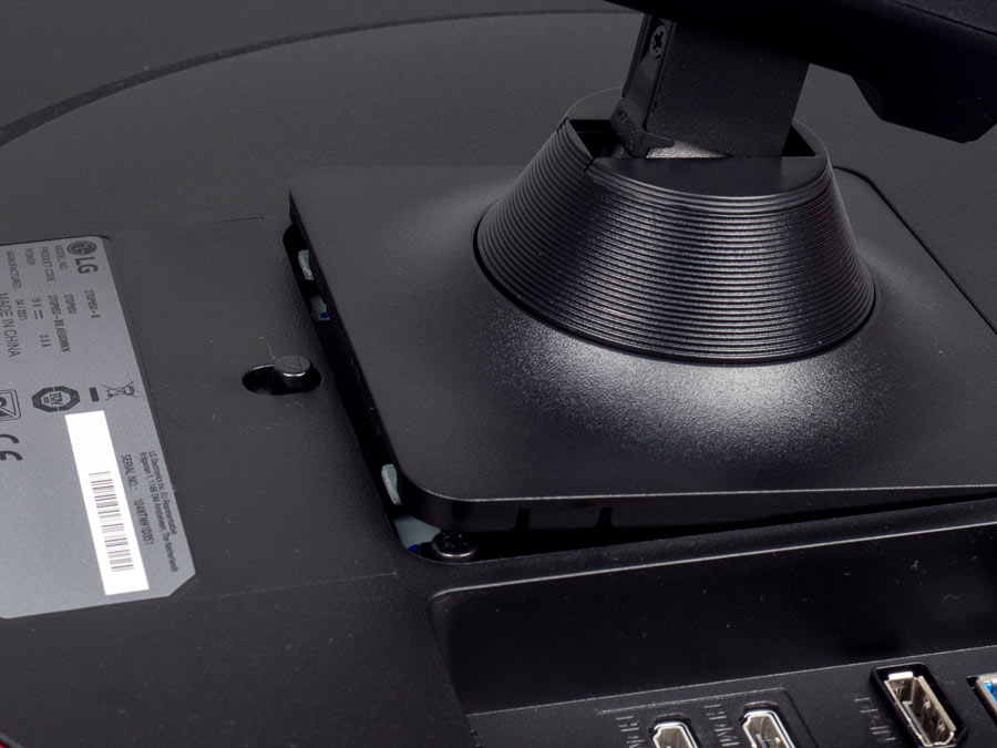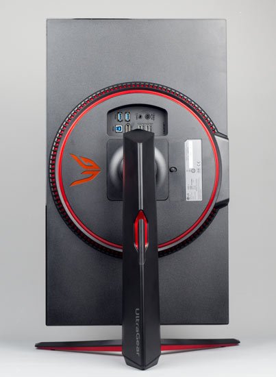 Im Inneren des Kreises ist das UltraGear-Logo als Relief eingebracht. Rechts neben der VESA-100-Vorrichtung/Monitorhalteplatte befindet sich das Anschluss-Panel.