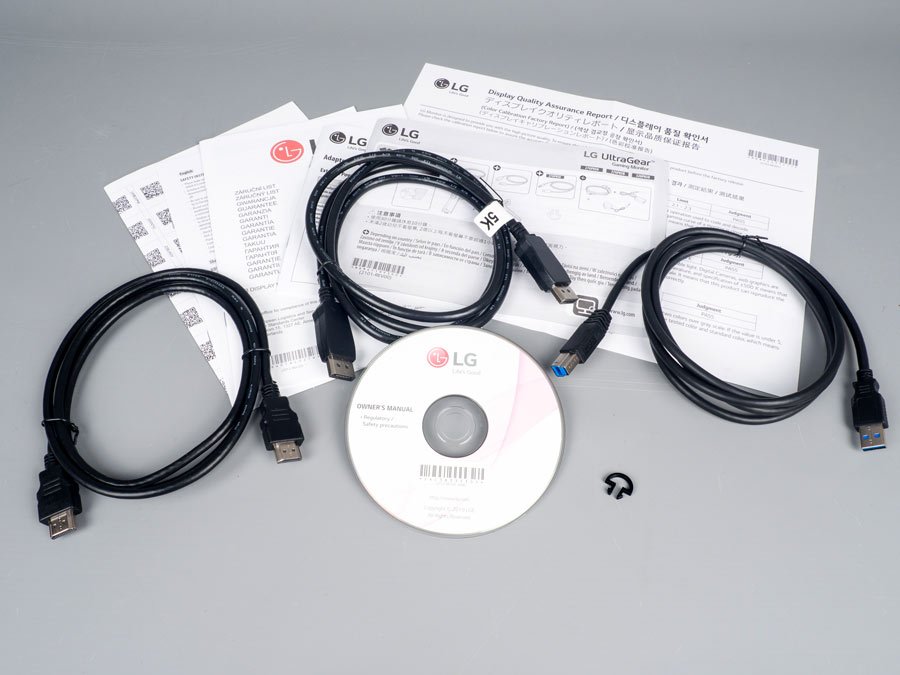 Um an den Inhalt zu kommen, wird der Karton über die breite Seite geöffnet. So muss nicht erst das komplette Innenleben aus dem Karton gezogen werden. Direkt nach dem Öffnen kommen Basis, Tragarm und Zubehör zum Vorschein. Letzteres besteht aus Netzteil, DP-, HDMI- und USB-3.0-Kabel, einer Klemme für das Mauskabel sowie Papierbeilagen (Sicherheitsanweisungen, ein Kalibrationsbericht und Garantie-Informationen). Die beiliegende CD-ROM trägt zwar die Aufschrift „Owner’s Manual“, doch auch hier sind nur jede Menge Sicherheitsinformationen aufgespielt, die sich wahrscheinlich nie jemand durchlesen wird.