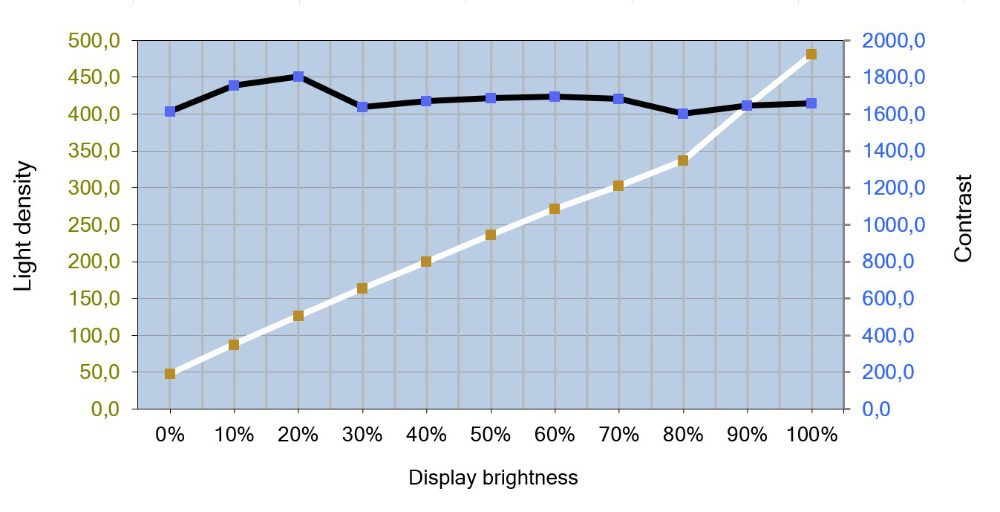 Das Kontrastverhältnis des IPS-Black-Panels wird vom Hersteller mit 2000:1 angegeben. Nach unseren Messungen beläuft sich der maximale Kontrast bei 20 % Helligkeit auf 1802:1 und im Durchschnitt auf ausgezeichnete 1678:1. Nach der Kalibrierung liegt er bei 1572:1.