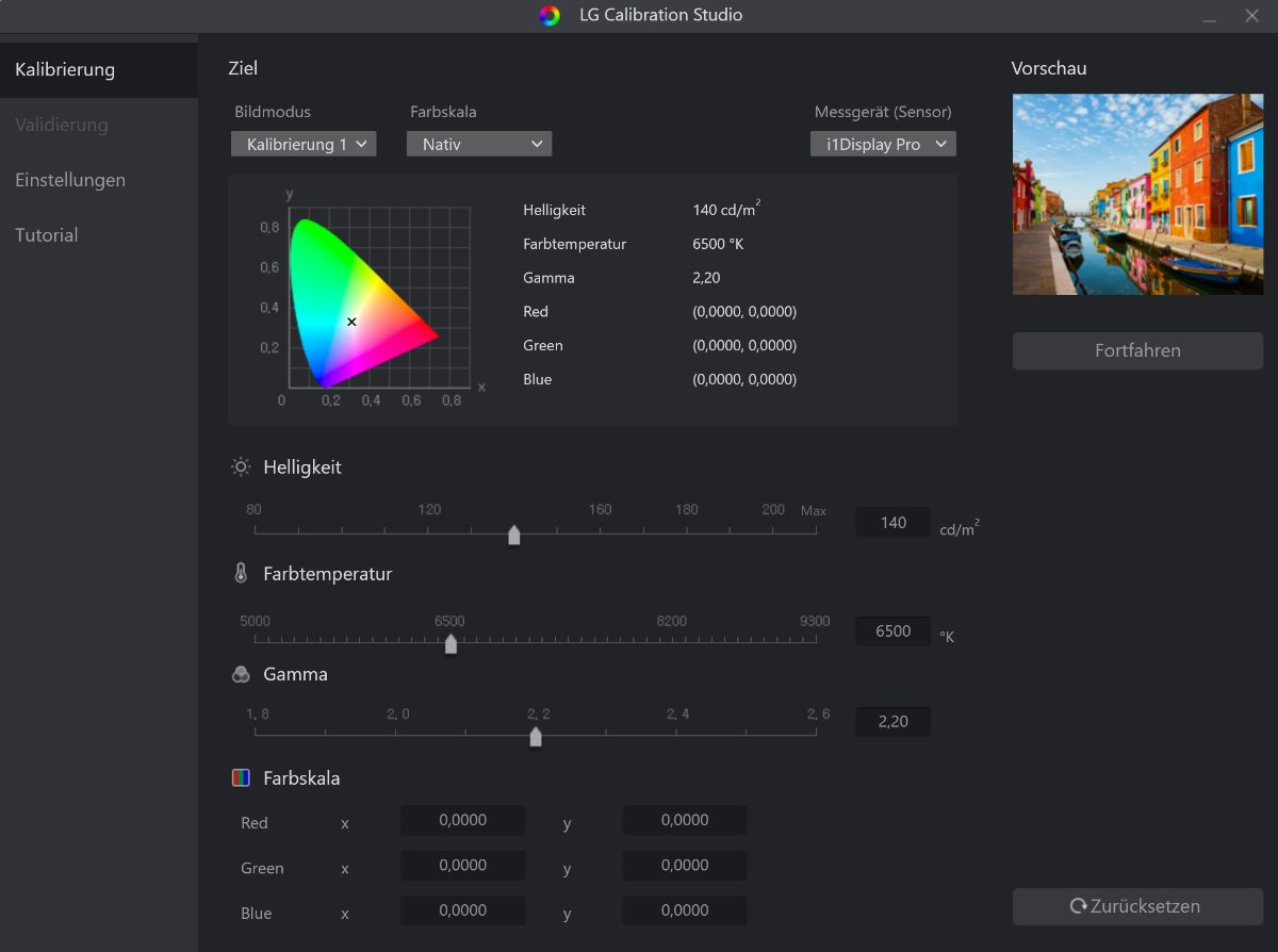 Wir haben zwei Kalibrierungen durchgeführt, einmal „Nativ“ und außerdem „sRGB“, wo der Farbraum entsprechend eingegrenzt wird. Wie üblich, wählten wir als Kalibrierungsziel zunächst folgende Einstellungen: Farbtemperatur „D65“, Gamma 2,2, Helligkeit 140 cd/m².