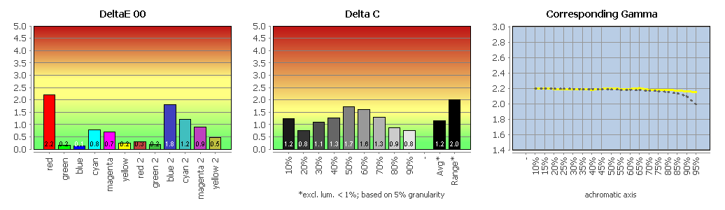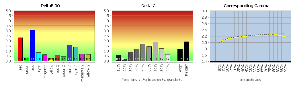 Die Graubalance (Delta-C-Average: 1,19) fällt befriedigend aus. Die Delta-C-Range kann mit einem Wert von 1,92 ein gutes Ergebnis erzielen. Die Farbwerte sind gut (Delta-E-2000-Average: 0,89). Der Gammawert beträgt im Schnitt exakt 2,18, und die Gammakurve verläuft korrekt. Die maximale Farbabweichung beläuft sich auf ein Delta-C-Average von 3,06 (RGB: 0 0 255).