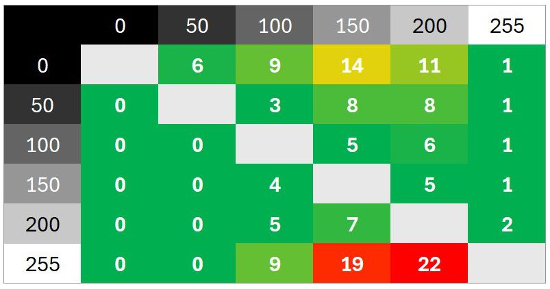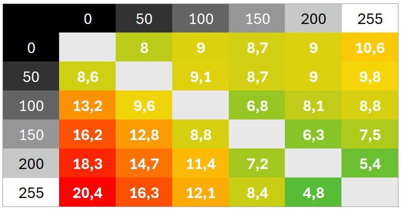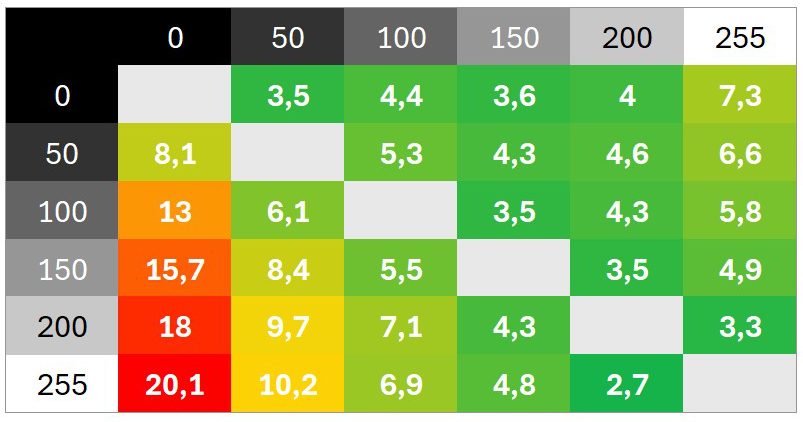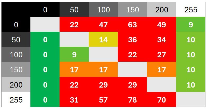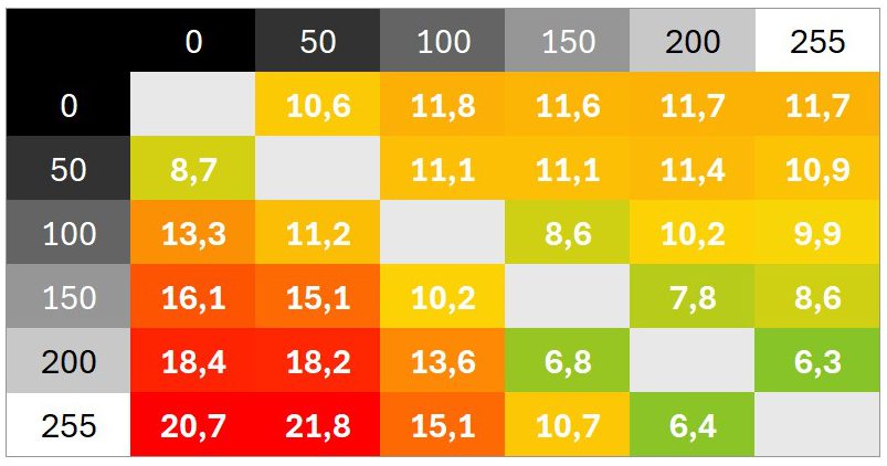 Überschwinger sind fast keine zu beobachten, die Abstimmung ist sehr neutral. Das Schaltzeiten-Diagramm zeigt unter anderem, wie sich verschiedene Helligkeitssprünge addieren und wie schnell der Monitor in der Werkseinstellung im besten Fall reagiert.
