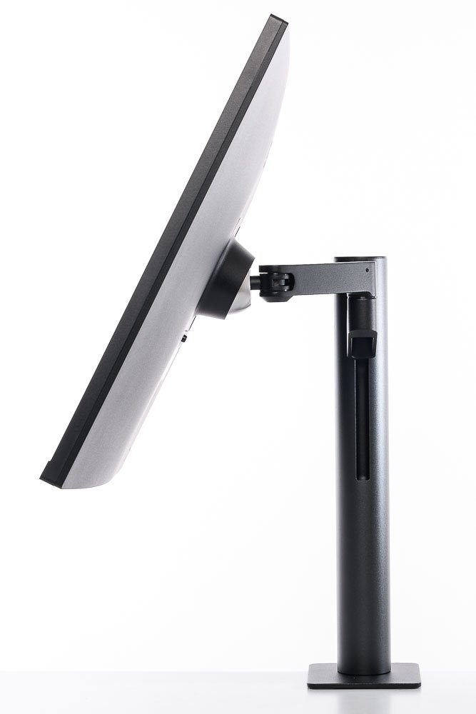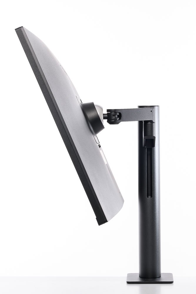 Für die Höhenverstellung ist der Schwenkarm Gasdruck-gefedert mit einem Verstellbereich von immerhin 13 cm ausgestattet. Bis auf die Tischoberfläche absenken lässt sich das Display zwar nicht. Wer nicht gerade beim Arbeiten das Kinn auf dem Schreibtisch abstützt, dürfte daran aber kaum Anstoß nehmen.