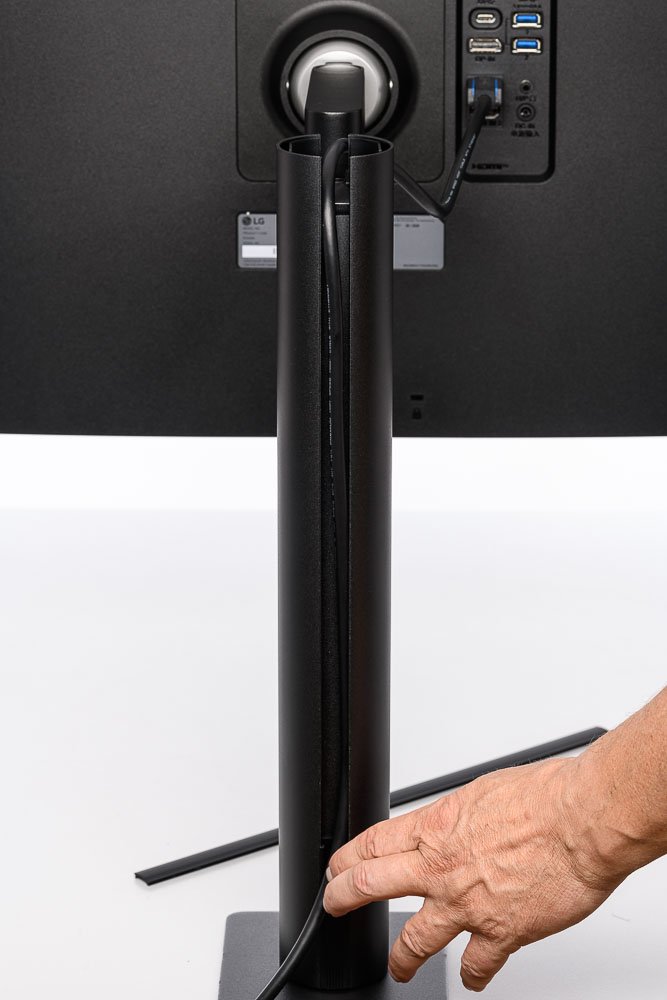 Die folgende Abbildung zeigt das Kabelmanagement in einer schematischen Übersicht. Wie in den Fotos unten zu sehen, ist der Kanal zum Durchführen der Kabel aber nicht sehr üppig ausgelegt. Bei der Belegung sollte man daran denken, dass sich beim Bewegen des Displays teilweise auch die benötigte Kabellänge ändert. Besonders elegant ist daher die USB-C-Verbindung, da man dann nur zwei Kabel in den Schacht legen muss.