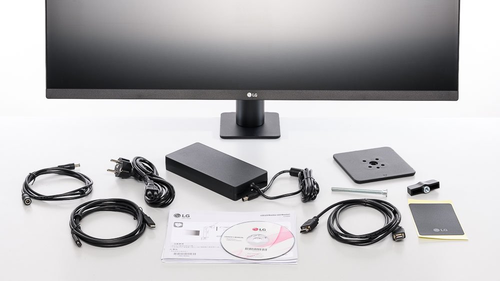 Die Angaben stimmen aber auch sonst nicht mit dem Lieferumfang überein. Beim USB-C-Kabel handelt es sich nicht um USB Typ A auf USB Typ C, sondern um USB-C an beiden Enden. Die beigelegte CD ist wenig informativ, da sie außer regulatorischen Hinweisen nichts enthält. Das Handbuch haben wir über die Website von LG gefunden, Standardfarbprofil und Treiber dagegen nicht.