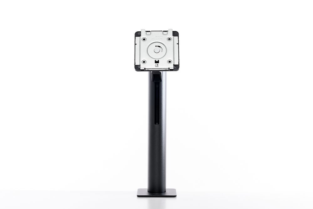 An das Kabelmanagement wurde bei der Konstruktion des Standbeins gedacht. Dazu kann oben die Kappe abgenommen werden, um dann die Kabel gebündelt im Standbein zu verstauen. Der zum Lieferumfang gehörende Aufkleber kann abschließend noch genutzt werden, um die Klemmplatte zu verschönern.
