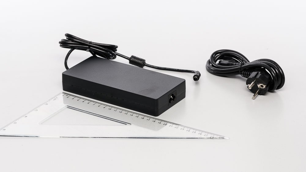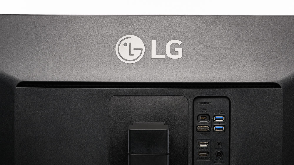 Die Stromversorgung ist beim LG 35BN77C-B in einem externen Netzteil untergebracht. Das Gerät benötigt daher zur passiven Entlüftung nur einen sehr schmalen Schlitz unterhalb des LG-Logos.