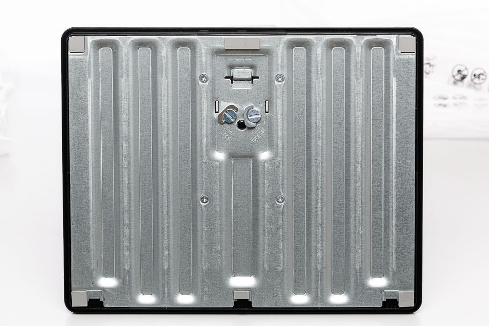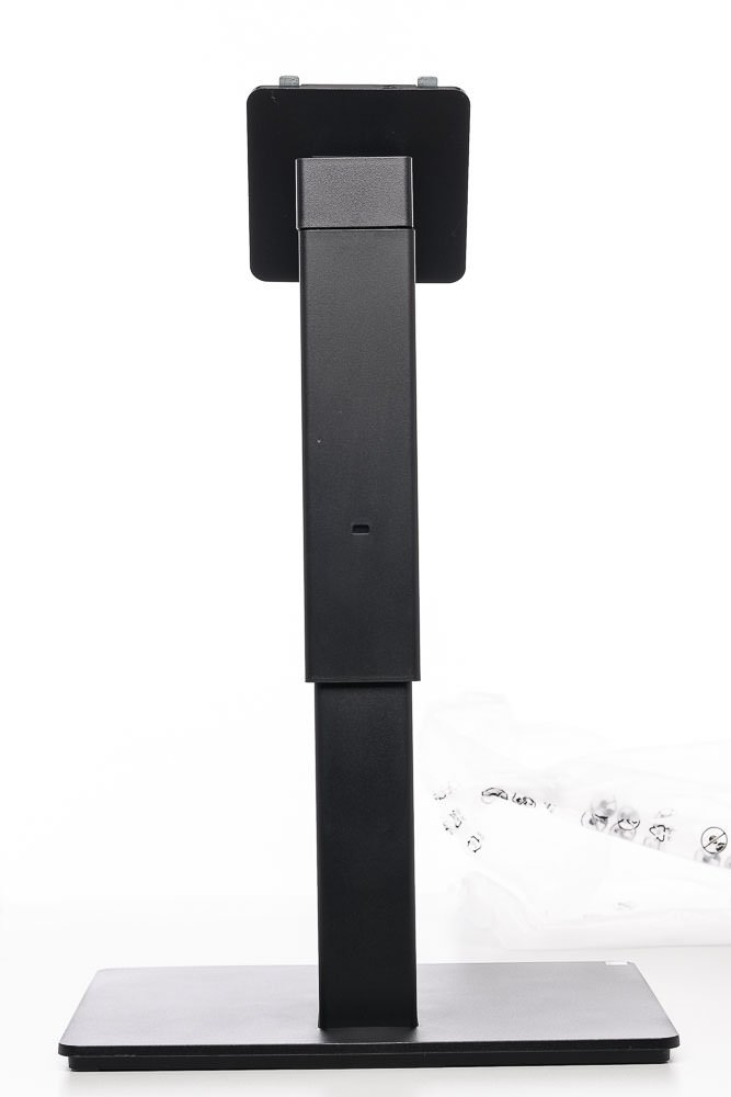 Da man beides einzeln herausnehmen kann, während das Display noch im Karton stehen bleibt, haben wir zunächst das Standbein auf der Bodenplatte eingehakt und dann auf der Rückseite mit den beiden Flügelschrauben fixiert.