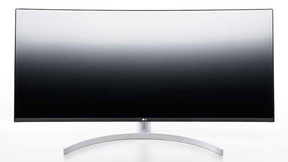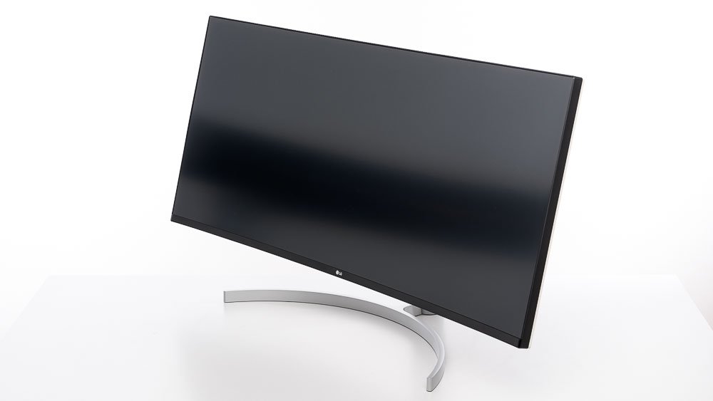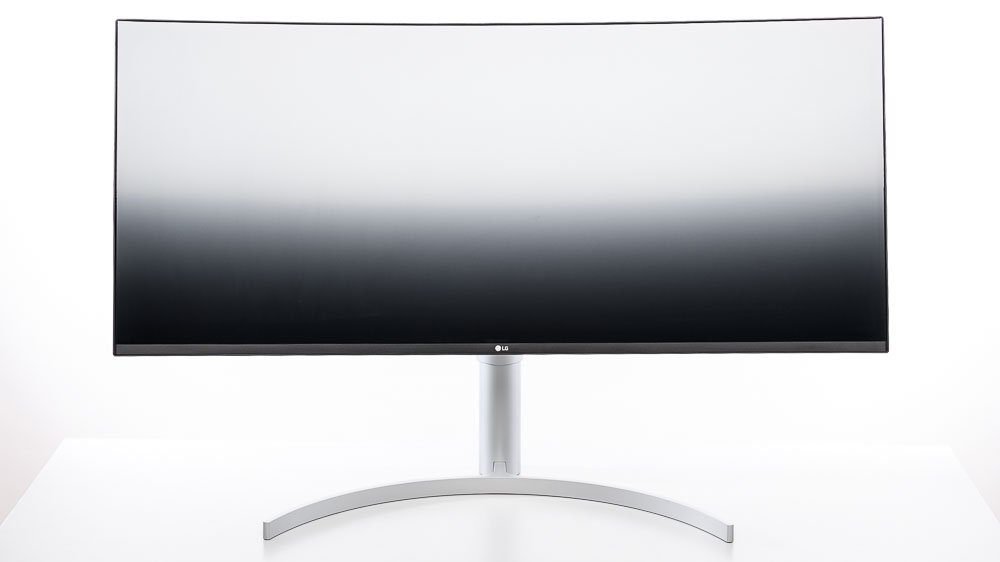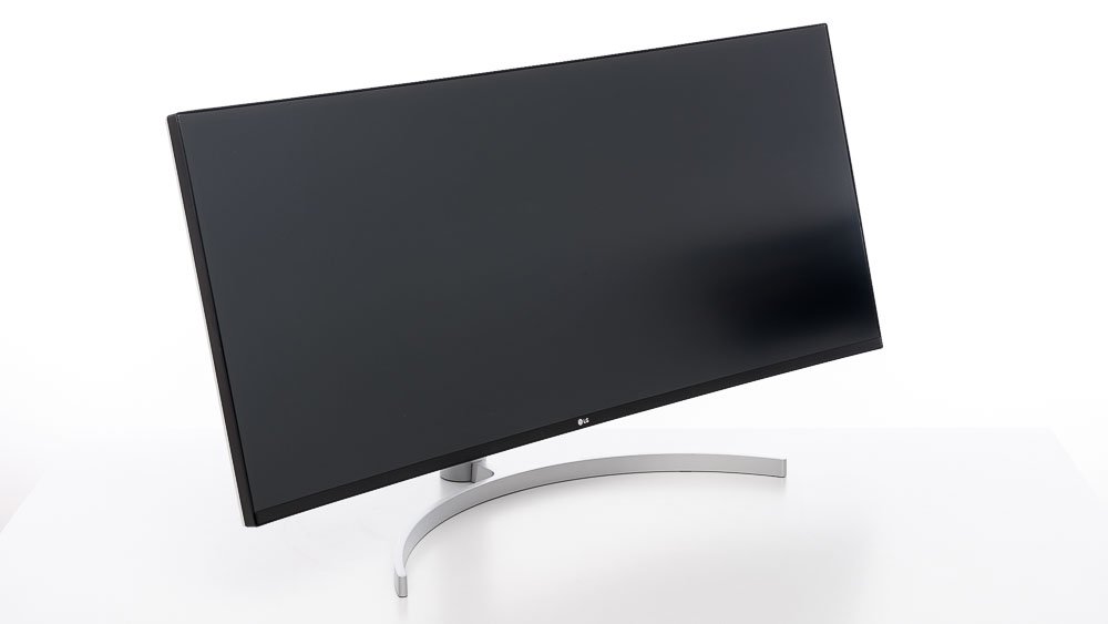 Äußerlich ist der LG 38WN95C-W in ein Gewand aus hochwertigem Kunststoff gehüllt. Der passend zum Display gewölbte Standfuß ist komplett aus gebürstetem Aluminium. Das Standbein ahmt diese Optik täuschend echt nach. Tatsächlich ist es außen aber aus Kunststoff.