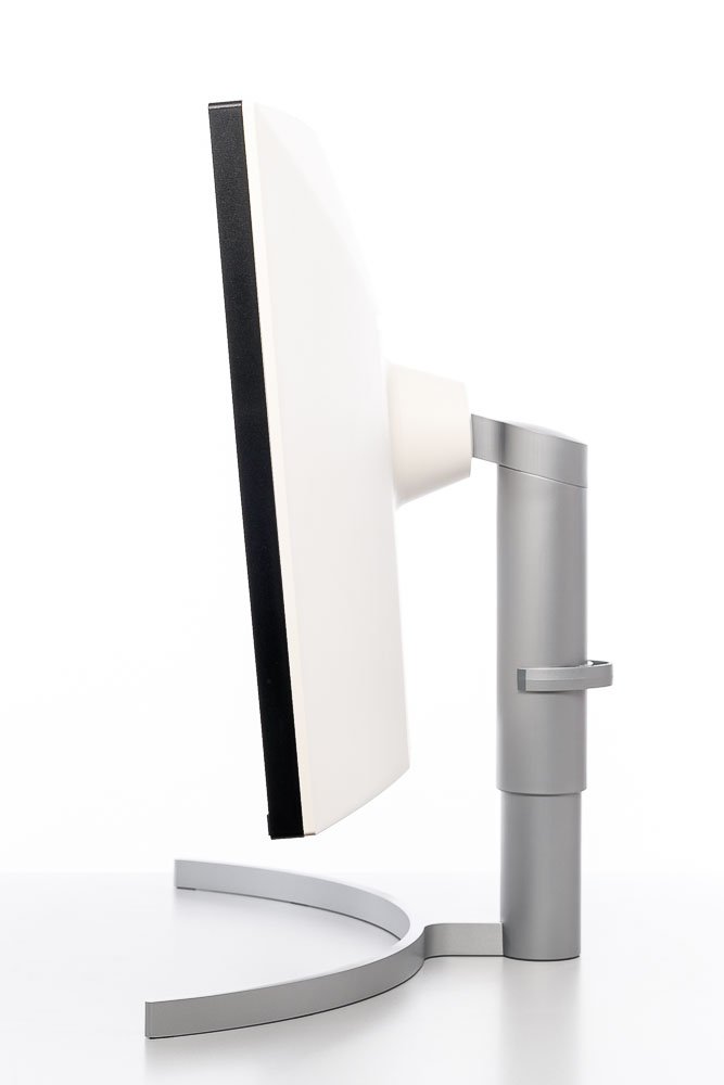 Hinsichtlich Ergonomie ergeben bei einem extrabreiten, gewölbten Display eine Pivot- und Drehfunktion wenig Sinn. Der LG 38WN95C-W besitzt aber nicht nur die bei Designer-Monitoren übliche Neigungsfunktion (- 5° bis + 15°), sondern kann auch um 11 cm in der Höhe verstellt werden. Beides funktioniert recht präzise, stabil und leichtgängig. Selbst ein seitliches Verdrehen ist zumindest um je 15° möglich.
