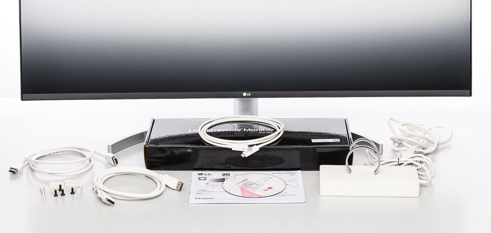 Der Lieferumfang des LG 38WN95C-W fällt so üppig aus, dass man ihn selbst vor dem Hintergrund eines 38 Zoll großen Widescreen-Monitors kaum aufgereiht bekommt. Dabei ist nach dem Auspacken zunächst alles fein säuberlich in einer separaten Box untergebracht.