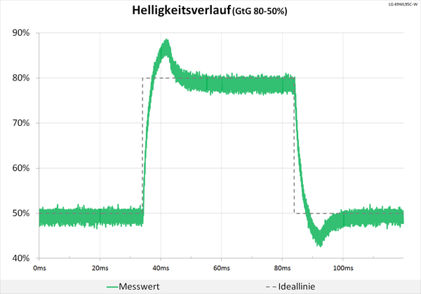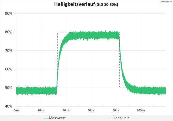 Die Latenz ist ein wichtiger Wert für Spieler, wir ermitteln sie als Summe der Signalverzögerungszeit und der halben mittleren Bildwechselzeit. Beim LG 49WL95C-W fällt die Signalverzögerung mit 11 ms für einen 60-Hz-Monitor glücklicherweise recht kurz aus. Da auch die Reaktionszeiten sehr flott sind, beträgt die halbe mittlere Bildwechselzeit im günstigsten Fall (Overdrive: „Schneller“) nur 5,8 ms. Insgesamt macht das 16,8 ms.