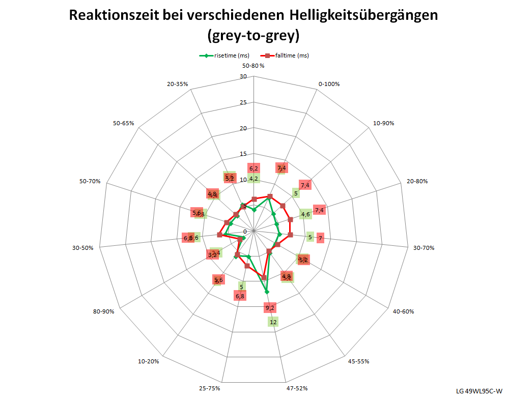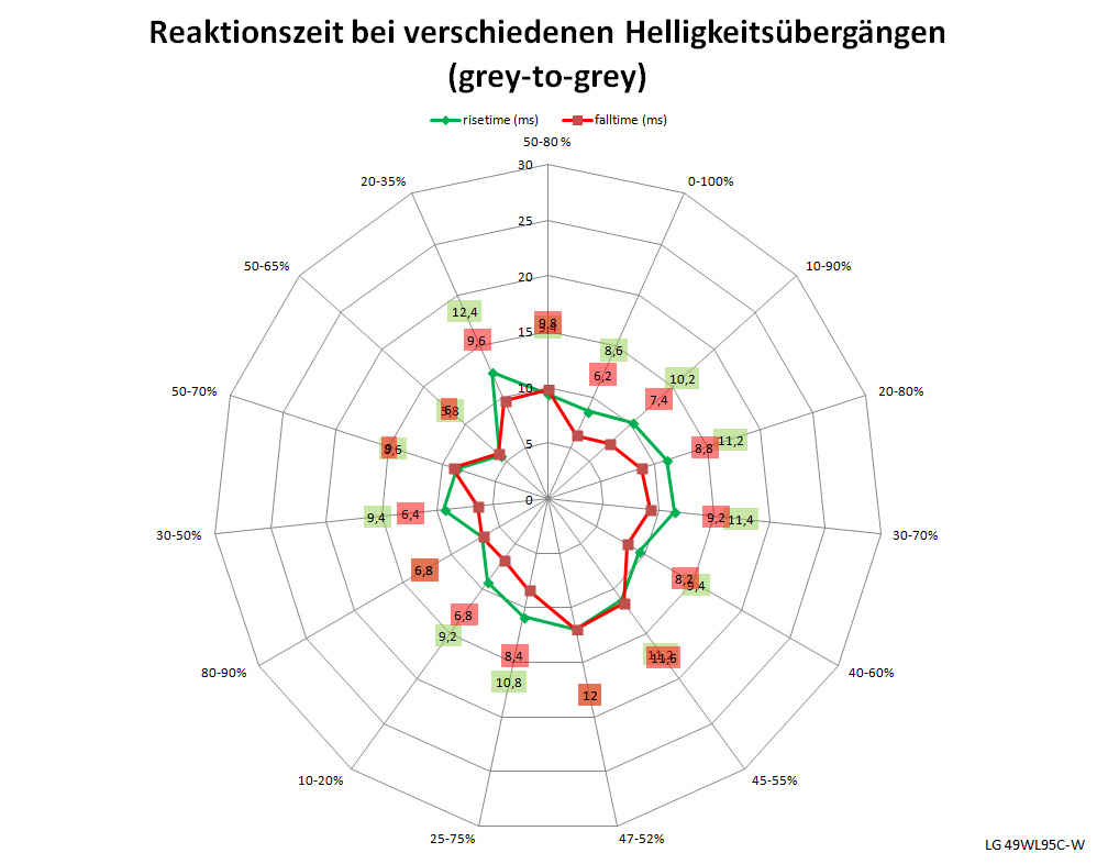 In den folgenden Netzdiagrammen sehen Sie alle Messwerte zu den unterschiedlichen Helligkeitssprüngen unserer Messungen im Überblick. Im Idealfall würden sich die grünen und die roten Linien eng am Zentrum befinden. Jede Achse repräsentiert einen im Pegel und in der Dynamik definierten Helligkeitssprung des Monitors, gemessen über Lichtsensor und Oszilloskop.