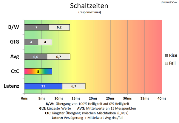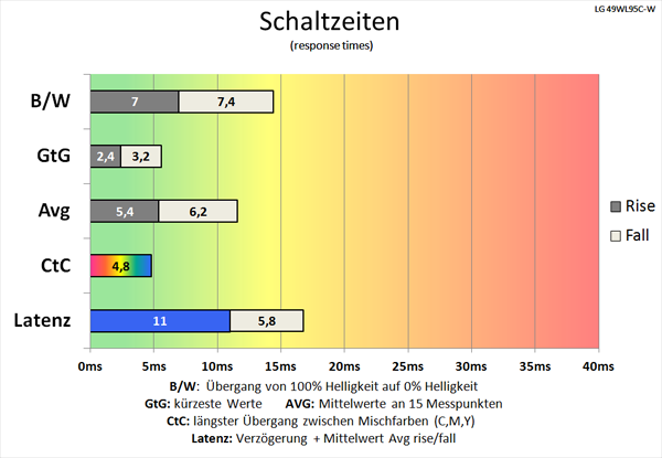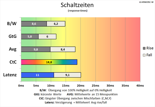 Das Schaltzeitendiagramm zeigt unter anderem, wie sich verschiedene Helligkeitssprünge addieren, wie schnell der Monitor in der Werkseinstellung im besten Fall reagiert und von welcher mittleren Reaktionszeit ausgegangen werden kann.