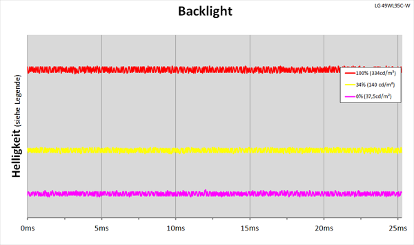 Die Hintergrundbeleuchtung des LG 49WL95C-W arbeitet mit W-LED und leuchtet kontinuierlich. Der Vergleich im Diagramm zeigt: Sowohl bei voller als auch bei reduzierter Einstellung der Helligkeit wird der Lichtstrom nicht unterbrochen, wie das bei PWM-Backlights der Fall wäre. Somit ist der Monitor auch bei reduzierter Helligkeit für längeres Arbeiten geeignet.