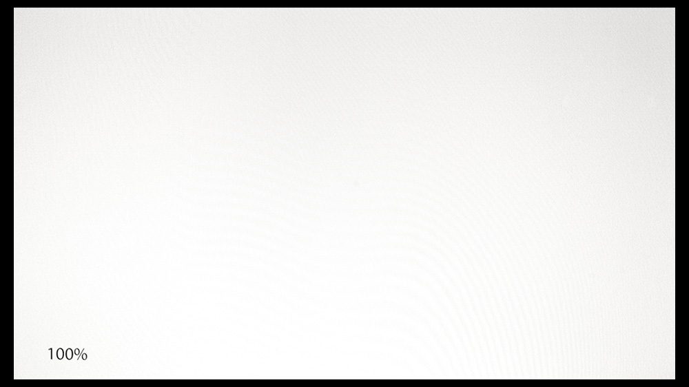 Wir untersuchen die Helligkeitsverteilung und die farbliche Homogenität mit einem 100 %-Weißbild, das an neun Punkten vermessen wird. Daraus berechnen wir zunächst die Helligkeitsabweichungen von der Mitte. Die Wahrnehmungsschwelle für Helligkeitsunterschiede liegt bei etwa 10 %.