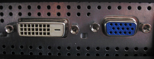 Senkrecht an der Gehäuserückseite befinden sich die Anschlüsse des Acer B223W. Dabei geht es sehr übersichtlich zu: Ein HDCP-tauglicher DVI-D- und ein analoger D-Sub-Eingang versorgen das Panel mit Bildsignalen.
