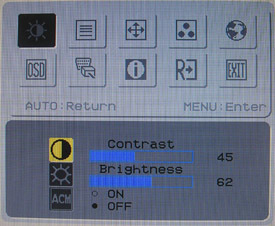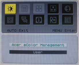 Nach dem Aufruf dieses Menüpunktes wird zunächst eine Auswahl zwischen dem „Acer eColorManagement“, hinter dem sich nichts anderes als die Auswahl der vordefinierten Bildmodi verbirgt, und Benutzereinstellungen angeboten. Diese ermöglichen die Justage von Helligkeit und Kontrast. Zusätzlich kann der dynamische Kontrast aktiviert und deaktiviert werden.