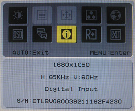 Aktuelle Signalparameter (Auflösung, Horizontal- und Vertikalfrequenz, ausgewählter Eingang und Seriennummer des Gerätes) werden dem Benutzer nach entsprechender Auswahl präsentiert.