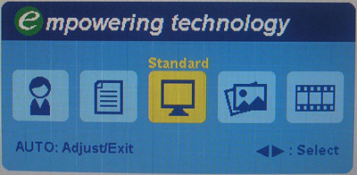 Die letzte Taste des Blocks ruft ein zweites OSD auf, das einen Direktzugriff auf die fünf Bildmodi erlaubt (User, Text, Standard, Graphik und Film). Sobald eine Änderung von Helligkeit oder Kontrast in einem der Modi über das OSD erfolgt, befindet man sich automatisch im User-Modus, die Bildmodi lassen sich also nicht anpassen.