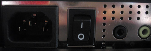 Neben dem Netzanschluss samt Netzschalter findet man noch zwei 3,5 Zoll-Klinkenstecker, die Tonsignale entgegennehmen und über die integrierten Boxen abspielen bzw. an externe Lautsprecher durchschleifen.