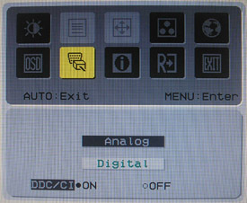 Eine Umschaltung zwischen den beiden Signaleingängen DVI-D und D-Sub erfolgt bei Auswahl dieses Menüpunktes. Gleichzeitig kann die Kommunikation des TFT-Monitors mit der Grafikkarte (und umgekehrt) aktiviert oder unterbunden werden.