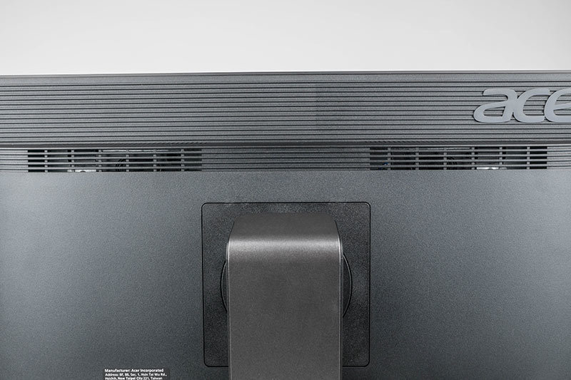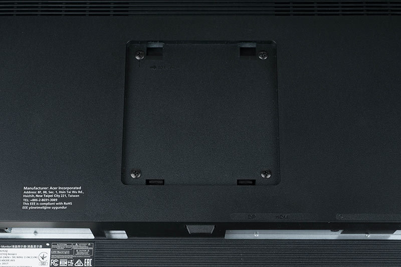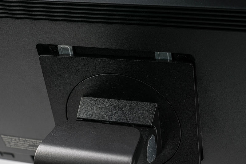 Der Zusammenbau des Monitors gestaltet sich einfach, da der Monitorarm bereits mit dem Fuß verbunden ist. Einzig das Display muss noch in die Trägerplatte des Monitorarms eingehängt werden. Hierfür befindet sich mittig in die Rückwand eingelassen die VESA-100-Vorrichtung, die auch gleichzeitig für alternative Haltevorrichtungen bereitsteht.