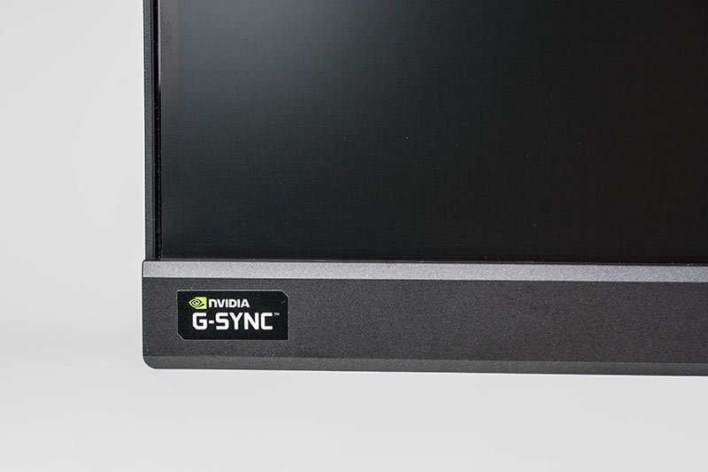 Auf der unteren Seite ist der Rahmen etwa 23 mm breit und zeigt auf der linken Seite einen Aufkleber mit dem G-Sync-Logo. Mittig ist das glänzende Predator-Logo eingelassen. Unterhalb des Rahmens befindet sich auf der rechten Seite die Betriebs-LED. Während des Betriebs leuchtet sie blau und im Standby orange.