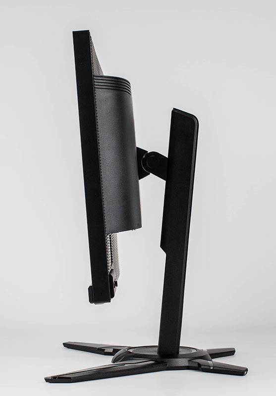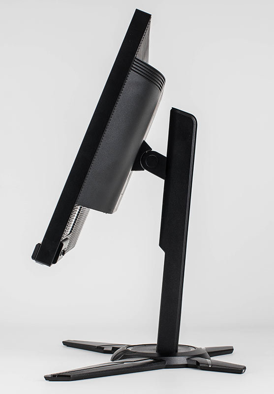 Der Monitorfuß verfügt vorn über zwei lange und hinten über zwei kurze Ausleger, die sternförmig angeordnet sind. Der Halt nach hinten ist gut, doch nach vorn fängt das Gerät, trotz des Metallkerns unterhalb des Fußes, leicht an zu kippeln, da der Monitor nicht sonderlich gut ausbalanciert ist.