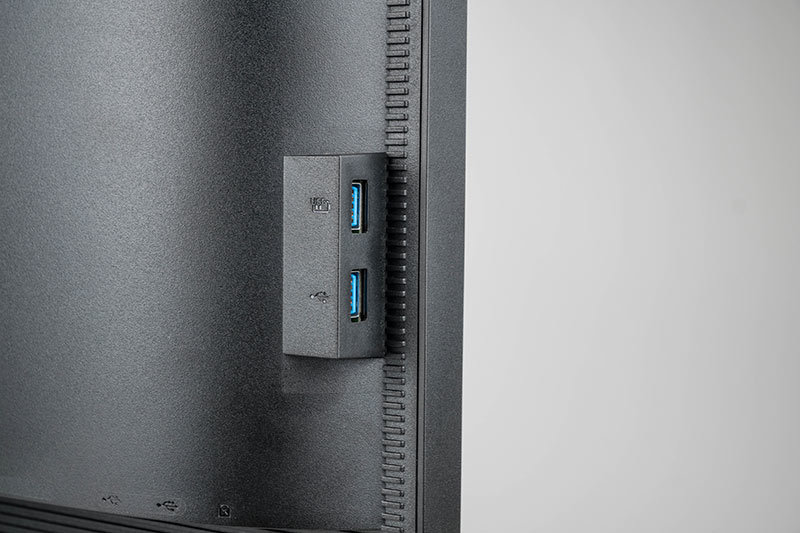 Die Tiefe des Acer Predator XB252Q beträgt oben und an den Seiten 20 mm. Etwas eingerückt befindet sich das Gehäuse, hinter dem die Elektronik untergebracht ist. Hiervon gehen seitlich zwei USB-3.0-Anschlüsse ab, wovon einer mit einer Schnellladefunktion für schnelladefähige Geräte ausgestattet ist.