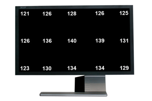 Die Helligkeitsverteilung ermittelten wir an 15 einzelnen Messpunkten. Bei einem Helligkeitswert von 53 erhielten wir in der Mitte des Displays mit 140 cd/m² den gewünschten Basiswert.