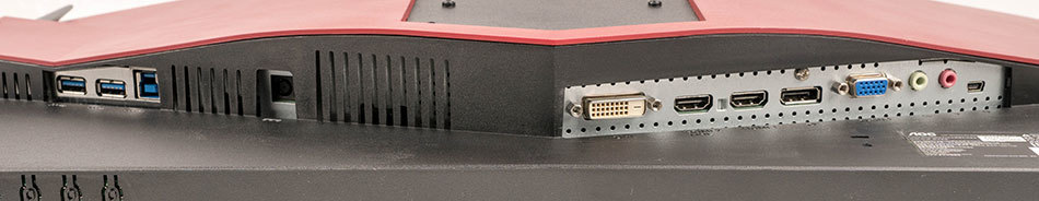 Wer einen Monitor mit vielfältigen Anschlussmöglichkeiten sucht, der ist beim AOC AG241QX genau richtig. Geboten werden ein DVI-Dual-Link-Port, zweimal HDMI (davon einmal mit MHL-Schnittstelle), einmal DisplayPort und als analoge Schnittstelle ein VGA-Eingang. Für den analogen Ton sind außerdem ein Kopfhörerausgang und ein Mikrofoneingang mit jeweils 3,5-mm-Klinkenbuchse vorhanden. Zusätzlich sind am Anschluss-Panel ein USB-3.0-Upstream-Port und zwei USB-3.0-Downstream-Ports zu finden.