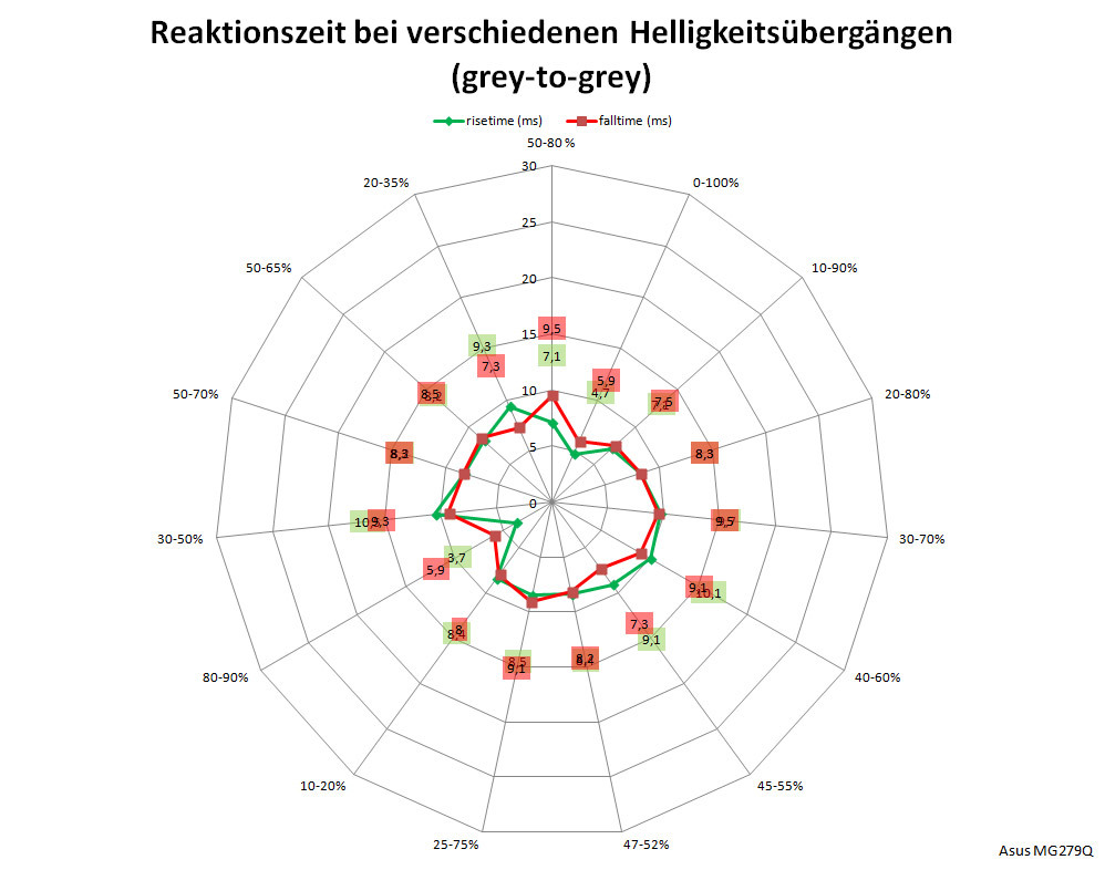 In den folgenden Netzdiagrammen sehen Sie alle Messwerte zu den unterschiedlichen Helligkeitssprüngen unserer Messungen im Überblick. Im Idealfall würden sich die grünen und die roten Linien eng am Zentrum befinden. Jede Achse repräsentiert einen im Pegel und der Dynamik definierten Helligkeitssprung des Monitors, gemessen über Lichtsensor und Oszilloskop.