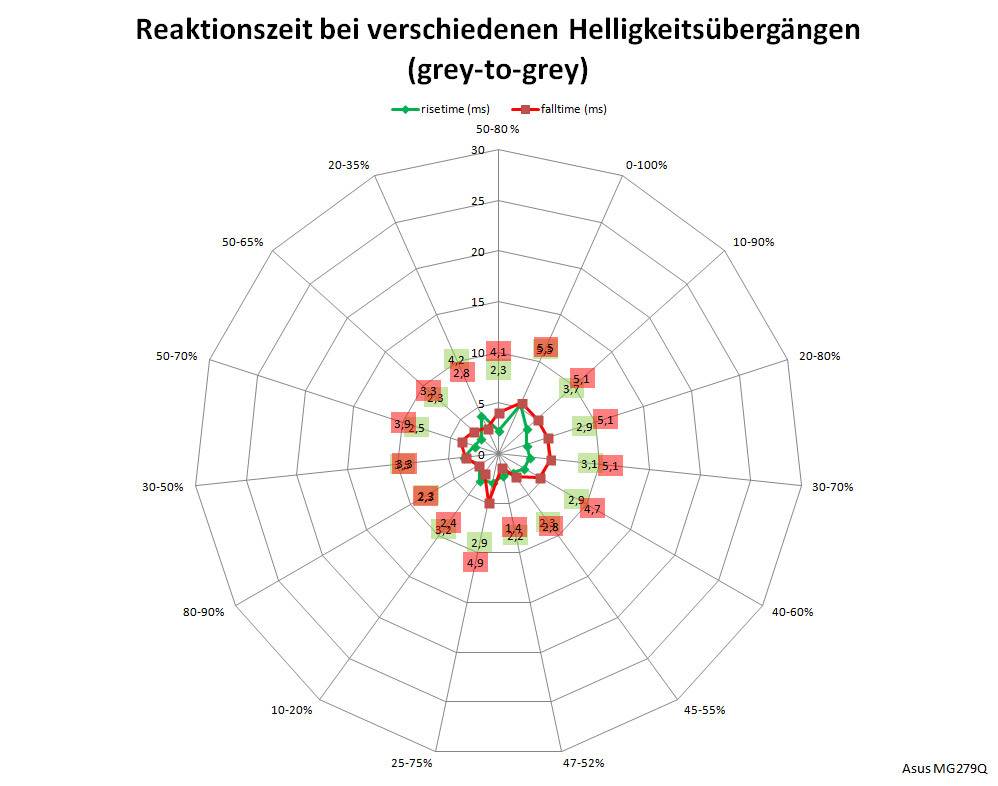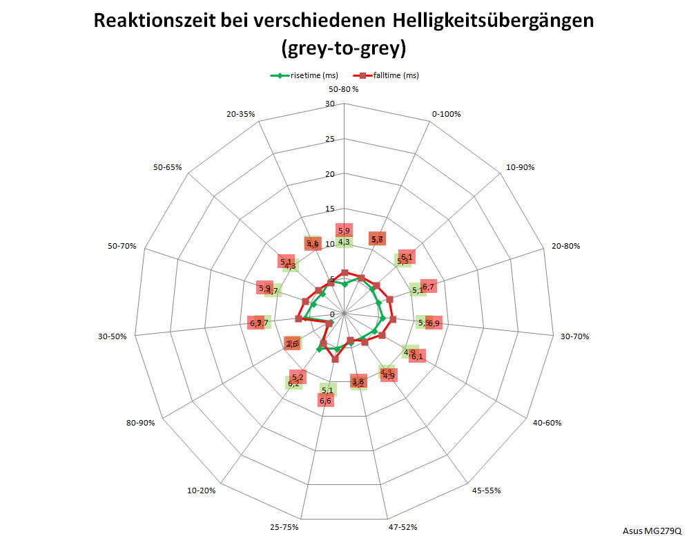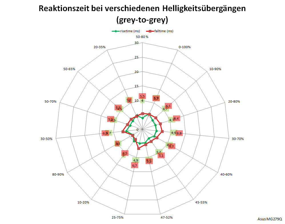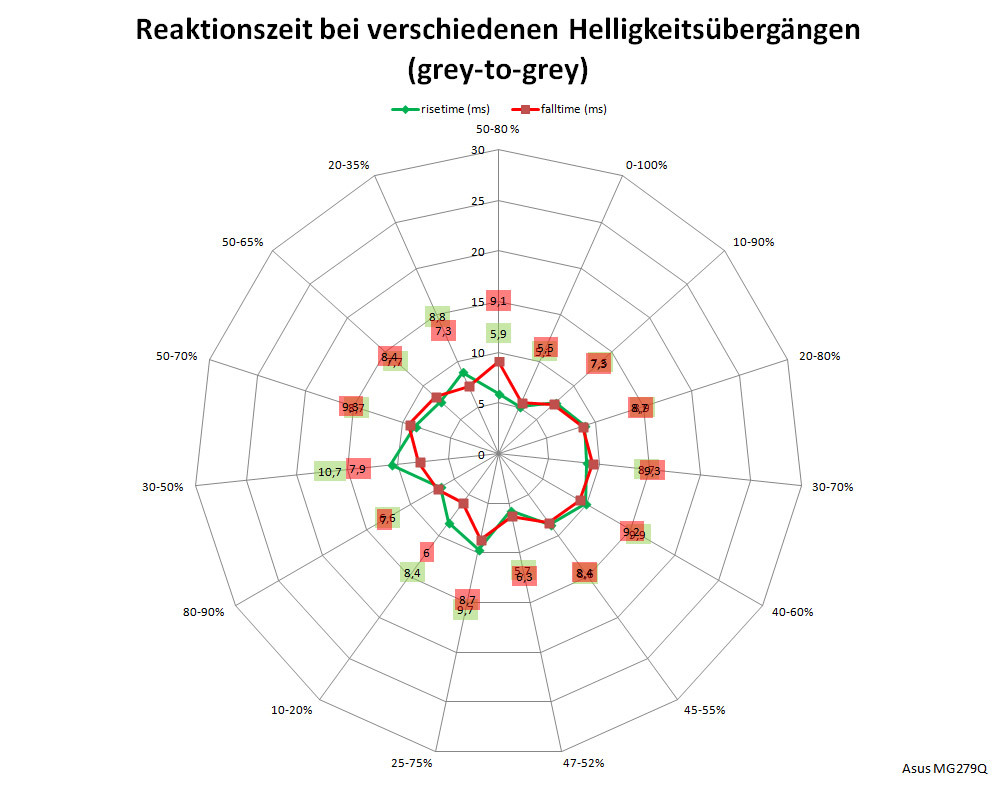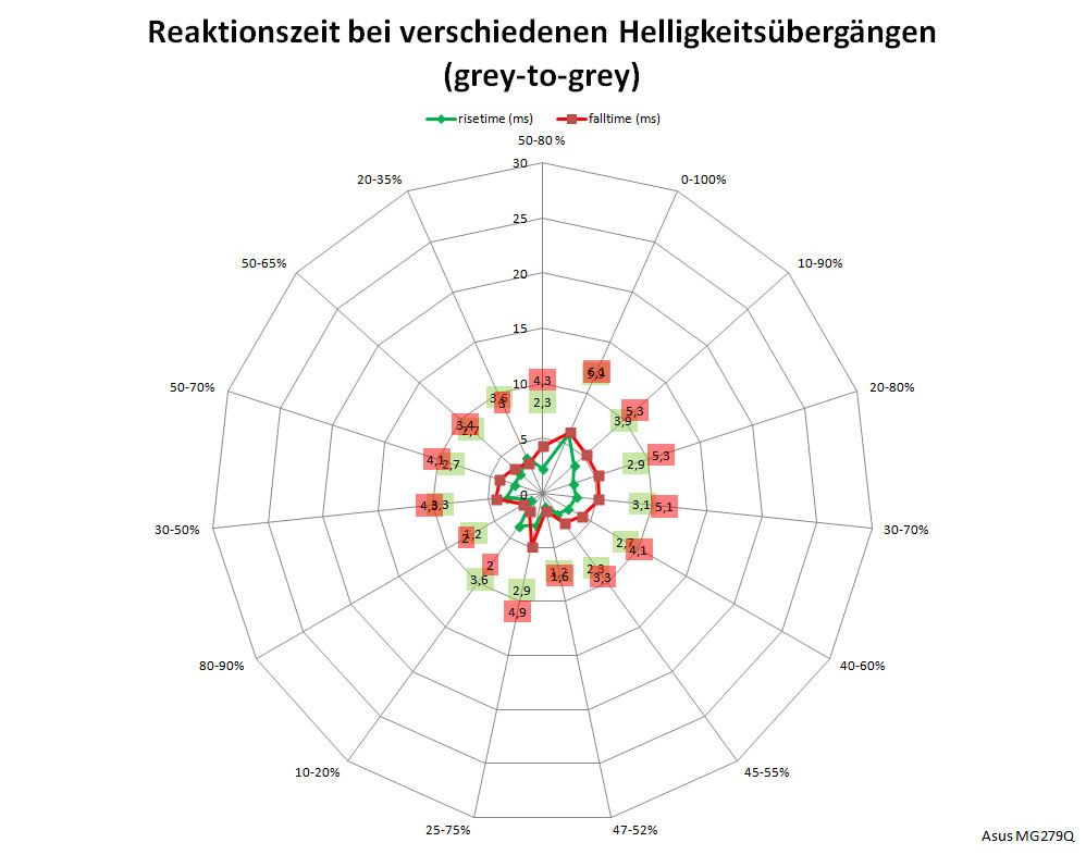 Die Latenz ist ein wichtiger Wert für Spieler, wir ermitteln sie als Summe der Signalverzögerungszeit und der halben mittleren Bildwechselzeit. Beim ASUS MG279Q messen wir mit 4,1 ms eine kurze Signalverzögerung. Die halbe mittlere Bildwechselzeit liegt bei ebenfalls guten 3,5 ms. Insgesamt macht das eine Gesamtlatenz von 7,6 ms, was das Modell auch für schnelle Shooter als gute Wahl erscheinen lassen.