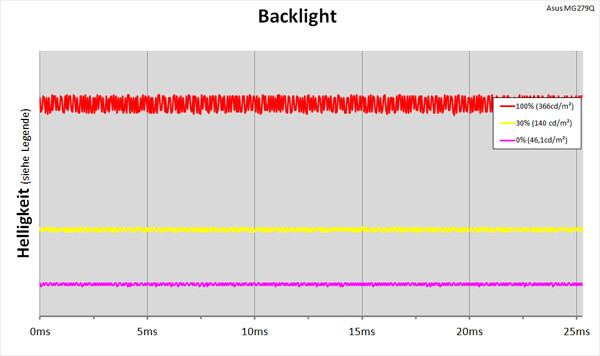 Die Hintergrundbeleuchtung des ASUS MG279Q arbeitet mit White LED und leuchtet kontinuierlich. Der Vergleich im Diagramm zeigt: Sowohl bei voller als auch bei reduzierter Einstellung der Helligkeit wird der Lichtstrom nicht unterbrochen, wie das bei PWM-Backlights der Fall wäre.