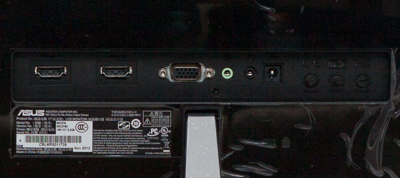 Der ASUS MX279H verfügt rückseitig über zwei HDMI-Anschlüsse. Daneben steht für analoge Signale ein VGA-Anschluss zur Verfügung. Außerdem findet man auf der Rückseite den Anschluss für das Netzteil, einen 3,5 mm Klinkenstecker für Kopfhörer und einen Audioeingang. Da der Monitor keinen internen USB-Hub integriert hat, müssen Zusatzgeräte direkt am Computer angeschlossen werden.