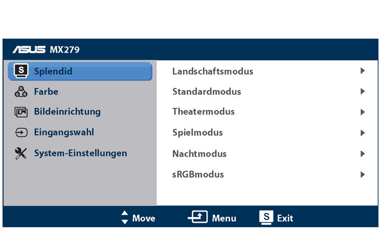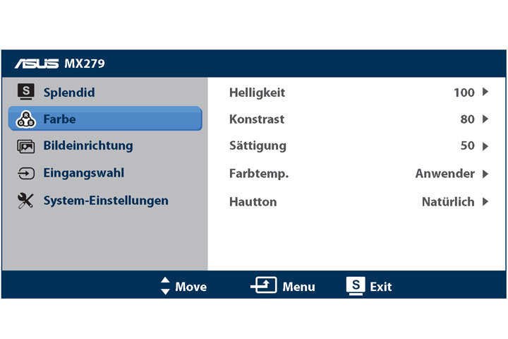 Beim Reset stellt der Monitor folgende Werte ein: Helligkeit 100, Kontrast 80, Schärfe 40. Der Bildmodus (SPLENDID) wird auf „Standard“ eingestellt.