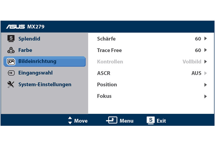 Das OSD ist so ausgelegt, dass einige Punkte direkt angesteuert werden können. Hierzu gehören die Lautstärke, die Helligkeit, die Wahl des Monitoreinganges, die Quick-Fit-Funktion sowie der Wechsel zwischen den verschiedenen Videovorgabemodi mit SPLENDID-Videotechnologie. Für alle übrigen Funktionen muss das Hauptmenü aufgerufen werden.
