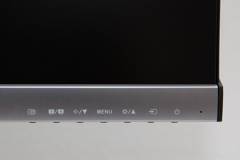 Die sieben Bedientasten sind an der Unterseite des Monitors angebracht. Die Beschriftung der einzelnen Tasten befindet sich auf der matten Aluleiste am unteren Displayrand. Die hohe Sensibilität der Bedientasten ist gewöhnungsbedürftig. Wenn man mit dem Finger von einer zur übernächsten Taste springt, sollte man darauf achten, die Taste dazwischen tunlichst zu meiden. Ansonsten springt man schnell im Menü an Stellen, die man nicht erreichen wollte. Nach einiger Eingewöhnungszeit konnten diese „Fehltritte“ minimiert werden.