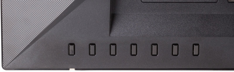 Im rechten Bereich gibt es unter dem Frontrahmen sechs mechanische Tasten mit denen das OSD des Monitors gesteuert werden kann. Die Tasten sind ausreichend große und haben einen angenehmen Druckpunkt. Bei jeder Betätigung wird zudem ein mechanisches Klickgeräusch erzeugt. Die Beschriftung ist zweckmäßig, aber nur bei ausreichend Umgebungslicht gut ablesbar. Da die Software keine zusätzliche Bezeichnung der Tasten einblendet, sollten sich Anwender die Funktionen der ersten vier Tasten möglichst einprägen.
