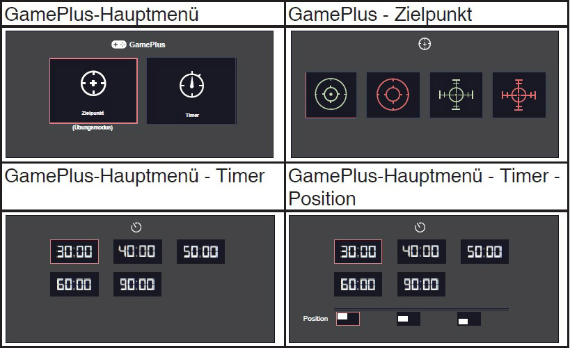 Unter dem Menüpunkt GamePlus verbergen sich zwei Optionen, die Spielern das Leben einfacher machen sollen. Es kann zum einen dauerhaft ein grünes oder rotes Fadenkreuz in der Mitte des Monitors angezeigt werden, was vor allem für Shooter hilfreich sein dürfte, die selber kein Fadenkreuz anbieten.