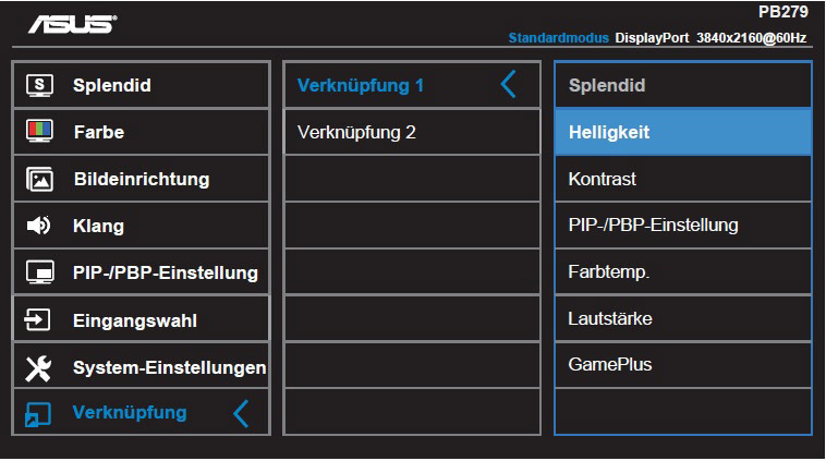 Voreingestellt sind für die letzten beiden Schnellzugriffe der Bildmodus und die Helligkeit. Im OSD lassen sich dort aber auch andere Eigenschaften hinterlegen, zum Beispiel der Kontrast, die Bild-in-Bild-Einstellungen, die Farbtemperatur, die Lautstärke oder der GamePlus-Modus.